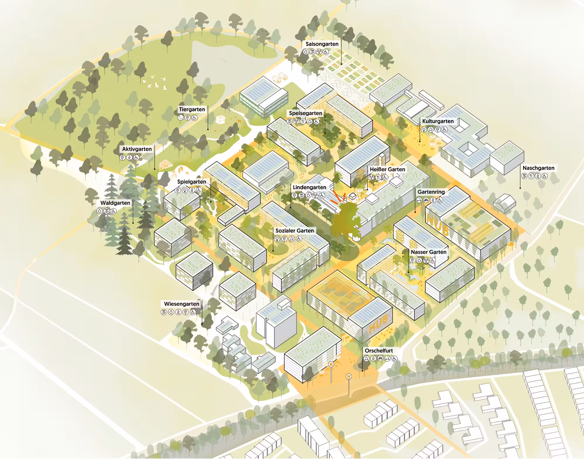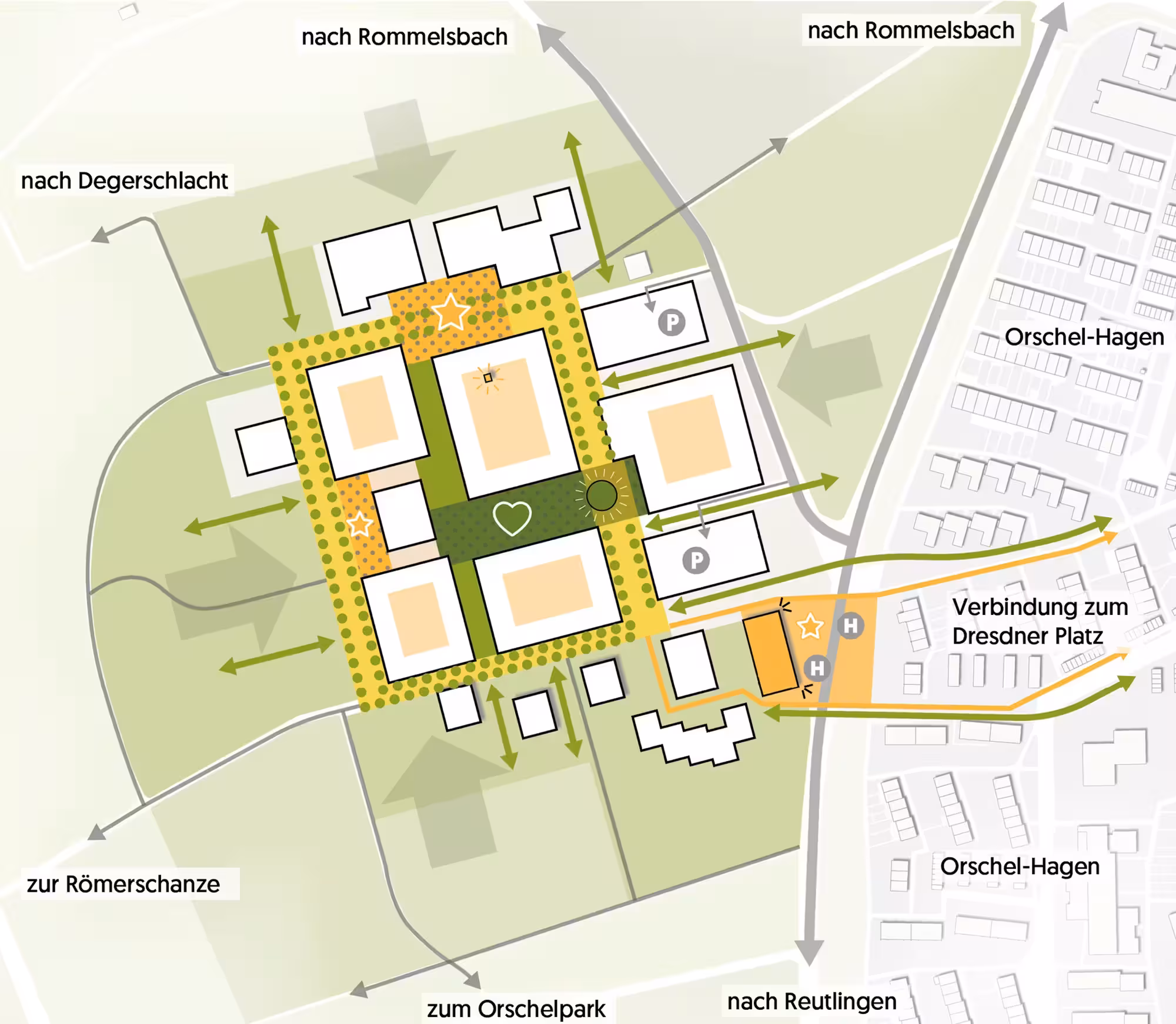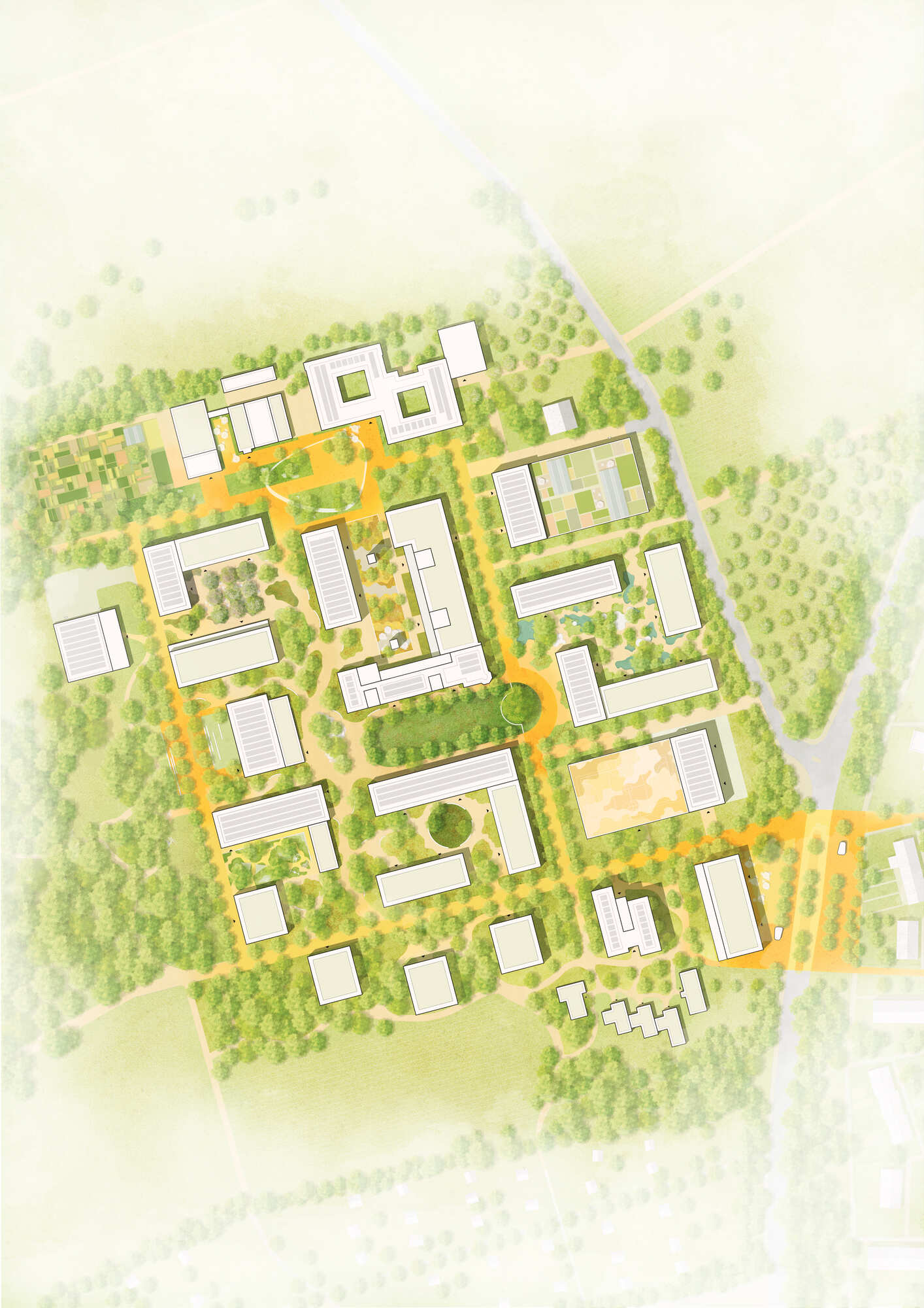 Rappertshofen in Reutlingen ist eine gemeinnützige Einrichtung für Menschen mit Körper- und Mehrfachbehinderungen, die eine Transformation mit neuen Nutzungen erfahren soll. Auch hier versuchten wir, die neuen Funktionen mit der Geschichte des Ortes und seiner freiräumlichen Spezifität in Einklang zu bringen. Einige Bilder, wie etwa der Lindenhain, der sich auf eine alte Linde in der Mitte bezieht, wurden von der Jury als anachronistisch empfunden. Wir hingegen hatten keine Schwierigkeiten mit scheinbar überkommenen Bildern und wollten entlang des Freiraumloops Ort für Ort Räume schaffen, die identitätsstiftend für die Transformation hätten wirken können, indem sich Altes und Neues über diese Räume versöhnen. Dies hätte jedoch eine spezifische Pflege erfordert, die von der Jury als nicht umsetzbar bewertet wurde.