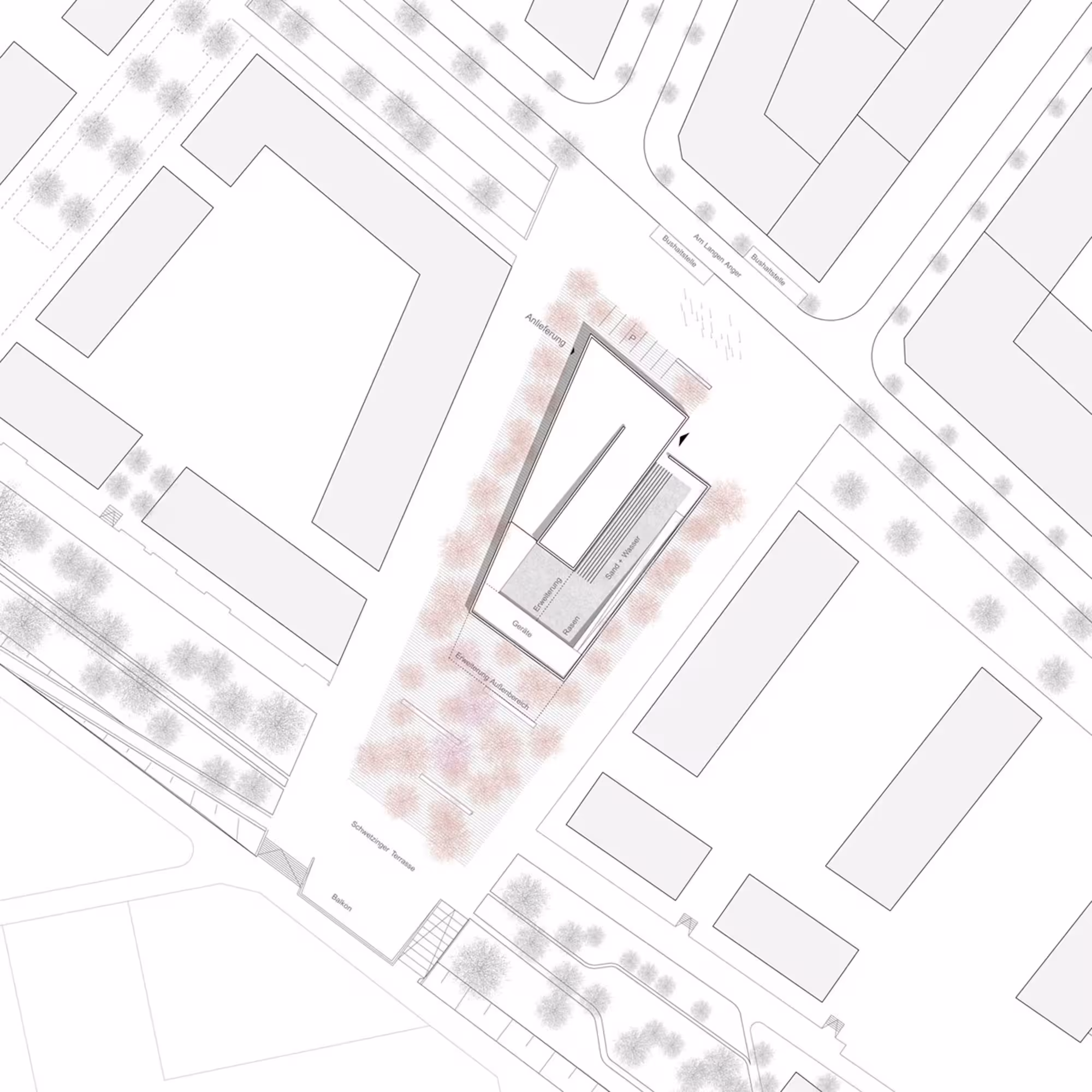 Auf der Schwetzinger Terrasse sollte eine Kindertagesstätte mit umgebendem Platz entstehen. Gemeinsam mit Harris Kurrle Architekten entwickelten wir das Bild einer eher hermetisch abgeschlossenen Anlage mit Hof, die von einem lockeren Hain aus Blütenkirschen umschmeichelt wird.