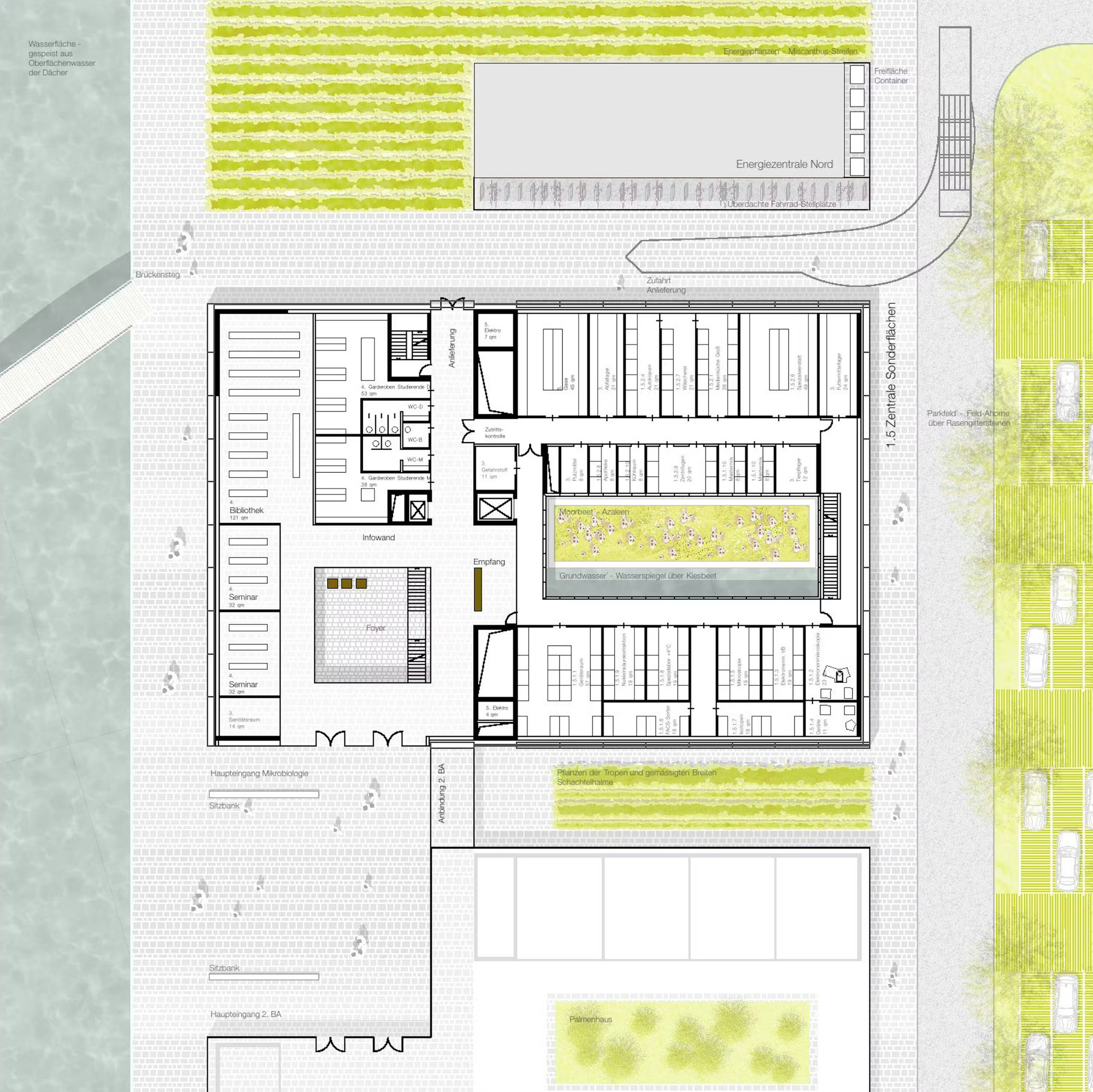 Bei der Umsetzung, die wir nur im Bereich der Mikrobiologie begleiten durften, verwiesen wir immer wieder auf die Schlichtheit des Konzepts, konnten damit jedoch weder die Bauherrschaft noch die umsetzenden Landschaftsarchitekten vollständig überzeugen. Die Querungen des Parks sollten sich wie Feldwege ins Terrain legen und jeweils an ihren Ansätzen durch einfache Baumgruppen betont werden. Die gliedernden und regelmäßigen Gärten im Institutsband als Zitate der Kulturlandschaft fielen zum Teil der geforderten Dichte und Größe der Gebäude zum Opfer.