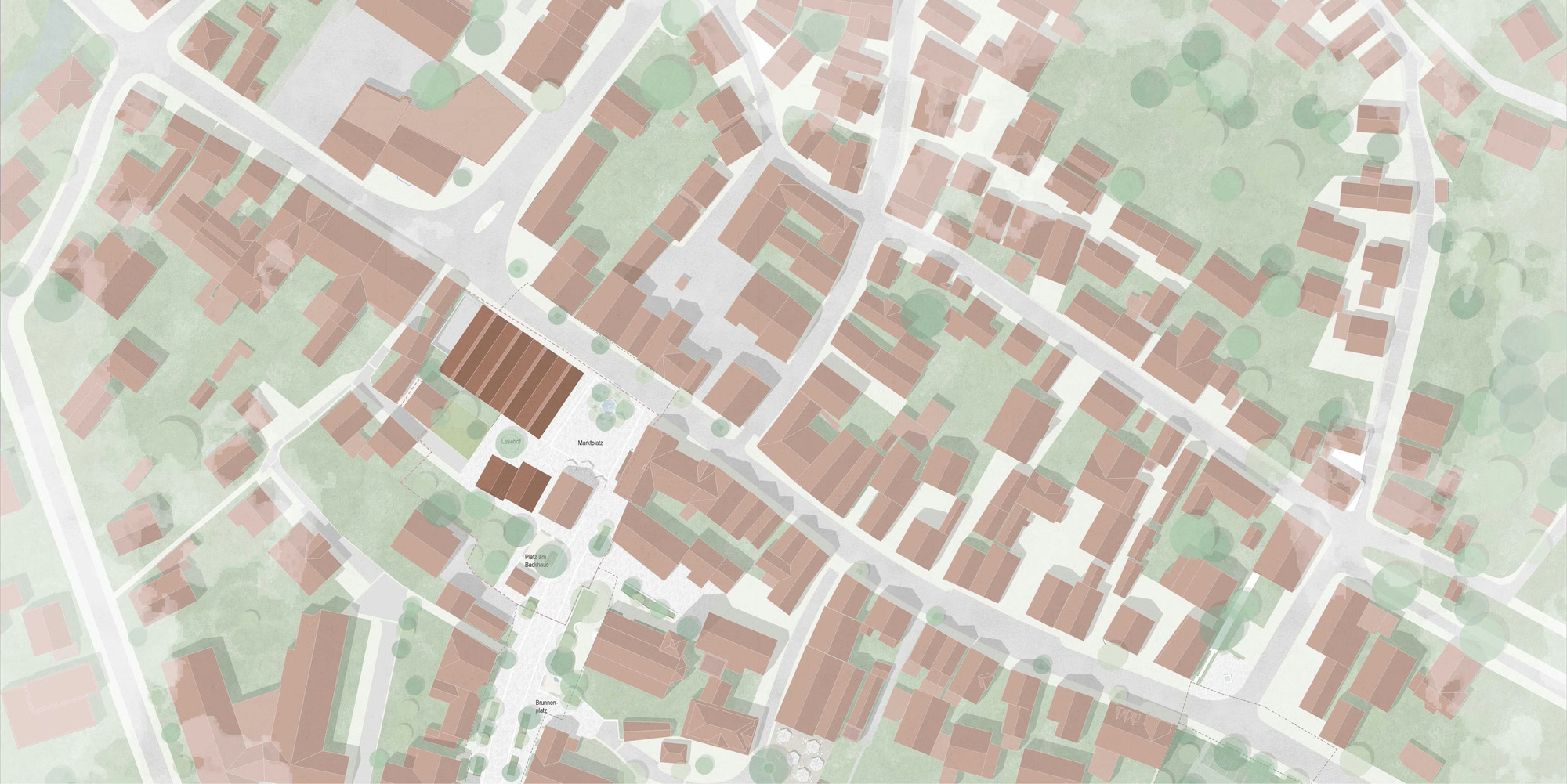 Neben dem Rathausneubau galt es im Rahmen des Wettbewerbs, einen zusammenhängenden Raum entlang der Murr sowie die Verbindung von der Murr bis zum Marktplatz zu gestalten. Während die Realisierungsaufgabe des Rathauses überwiegend von Steimle Architekten bearbeitet wurde, beschäftigten wir uns mit dem Ideenteil und wählten dafür eine zurückhaltende Annäherung an den Fluss – in Kenntnis der Sensibilität von Flussufern sowohl in hydraulischer als auch in ökologischer Hinsicht. Die Eingriffe am Rand der Murr wurden minimiert, und der kleine Park entlang des Flusses eher zum Ort hin orientiert. Damit wurde bewusst darauf verzichtet, den Begriff der „Murrterrassen“ gestalterisch wörtlich umzusetzen. Die Grafik von Josepha bringt diese Zurückhaltung sehr treffend zum Ausdruck.