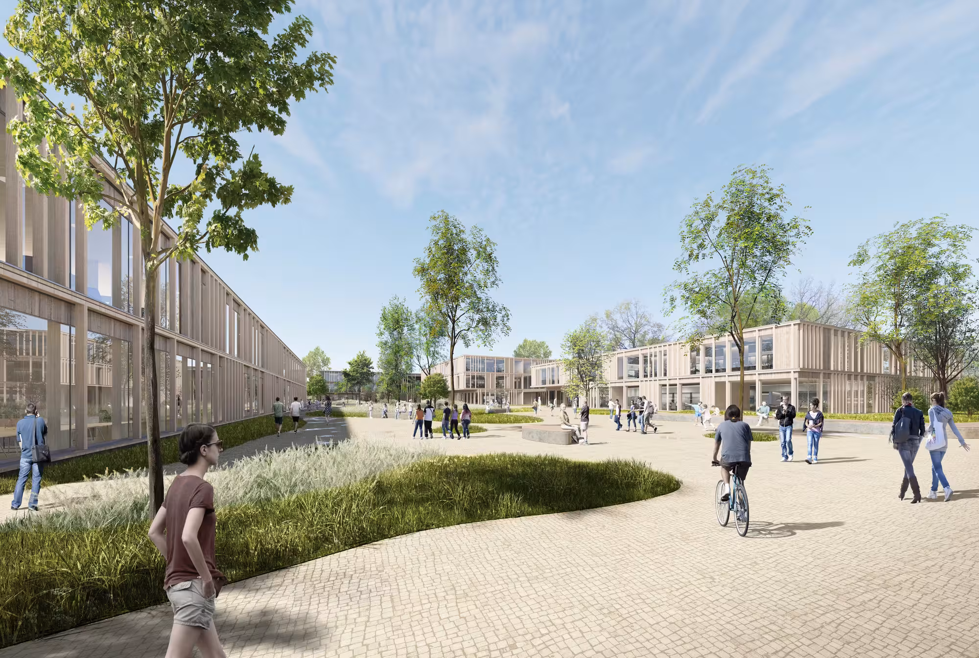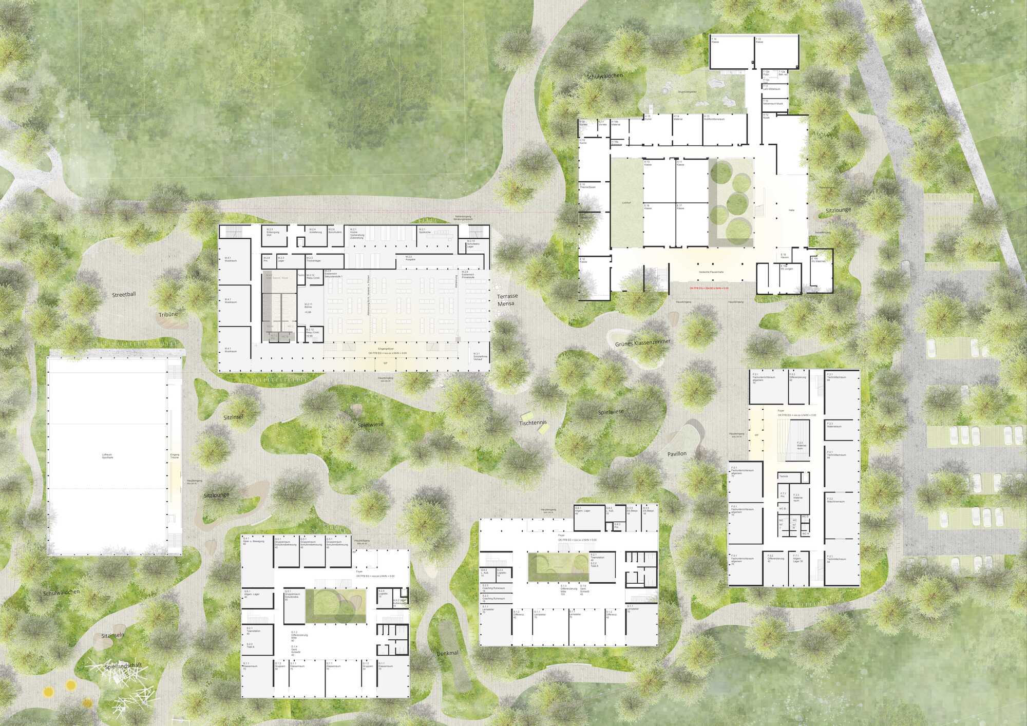 Kornwestheim wirkt nicht wie eine gewachsene Stadt, sondern eher wie ein Ort, der im Speckgürtel von Stuttgart groß geworden ist und noch nach seiner Identität sucht. Der Schulcampus Ost liegt durch die Bundesstraße 27 von der Innenstadt getrennt. Das im Wettbewerb entwickelte Konzept entstand aus der Verbindung zum nahegelegenen Stadtpark sowie zur Landschaft im Süden. Deshalb entwickelt sich der Freiraum im Zentrum der aus dem rechten Winkel entwickelten Anlage weich und landschaftlich. Die Form ermöglicht Flexibilität und eine Anpassung an die Bedürfnisse der unterschiedlichen Schulen sowie einen respektvollen Umgang mit dem vorhandenen Baumbestand.