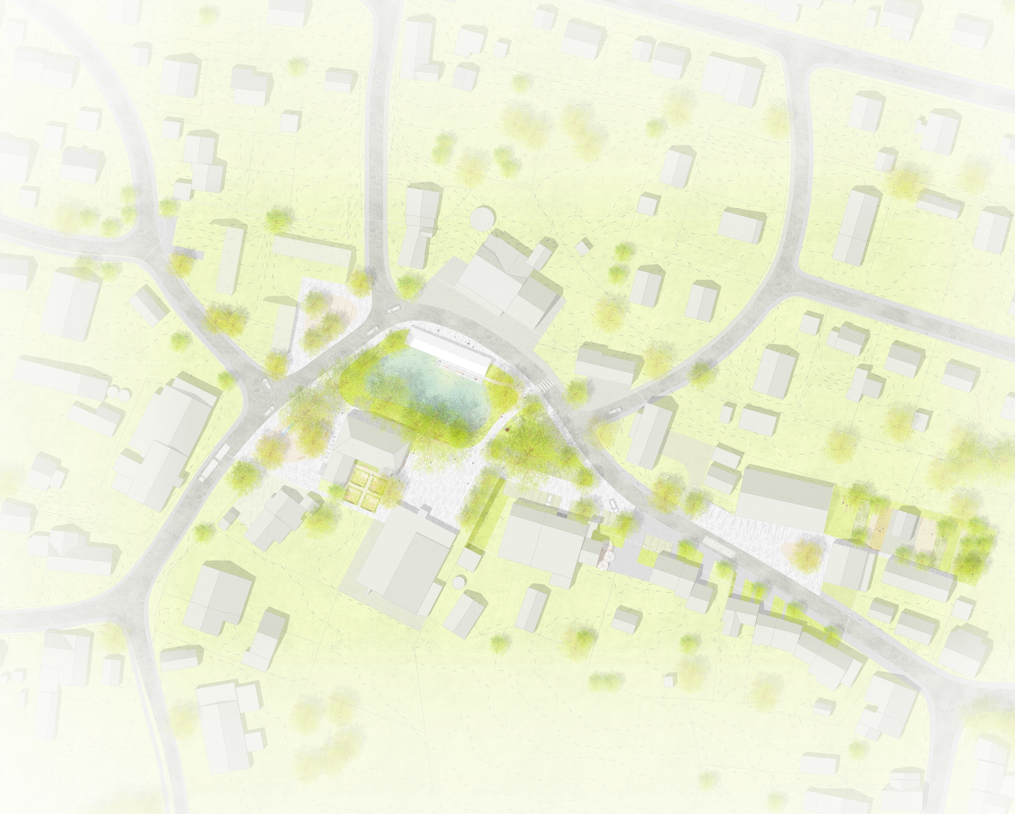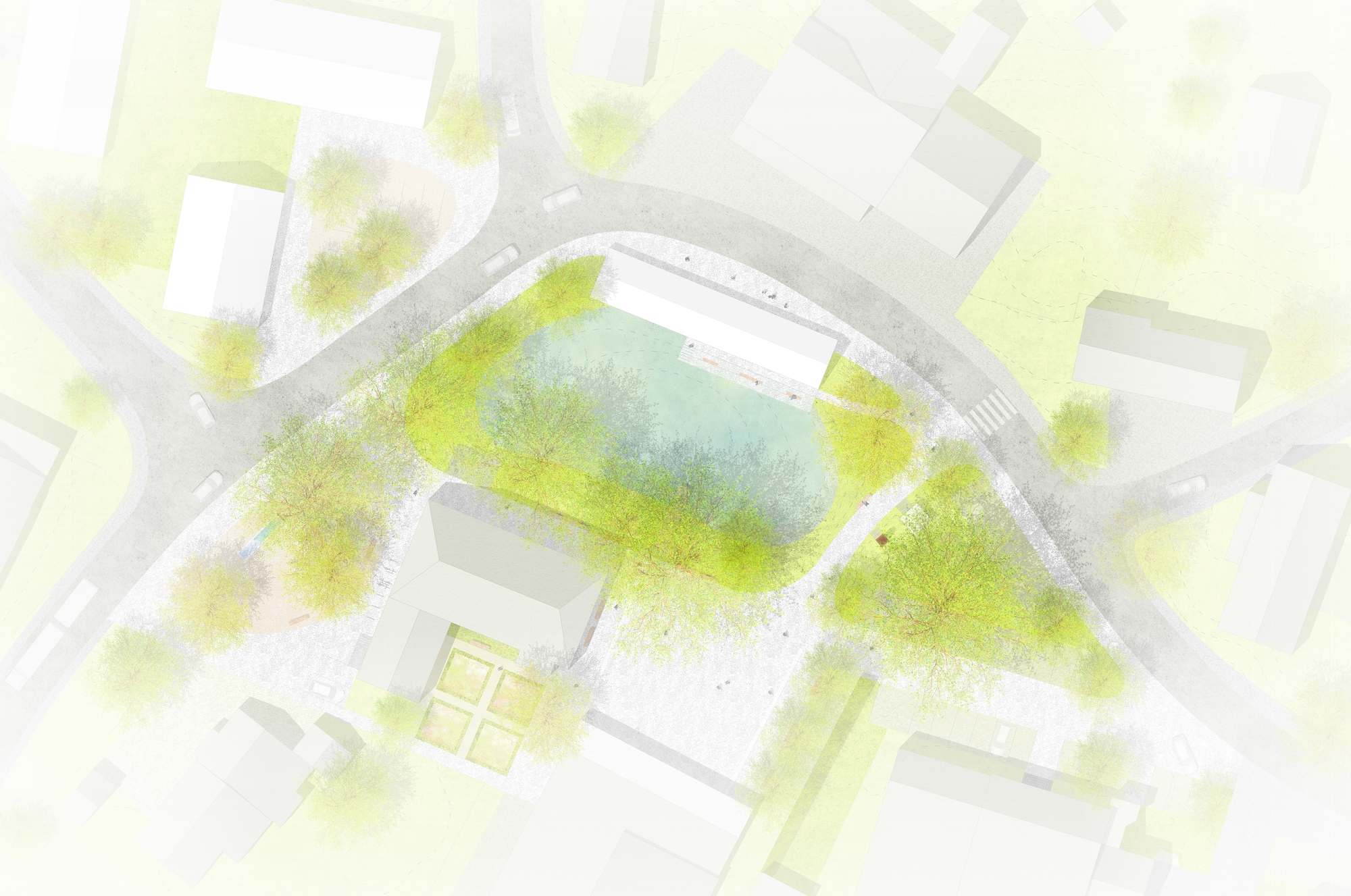 Für die Gestaltung der Ortsmitte im Schwarzwald-Baar-Kreis entschieden wir uns bewusst dagegen, urbane Elemente in den Mittelpunkt zu holen. Stattdessen gaben wir der Landschaft mit einem Teich – einer Hülle – den Vorrang.