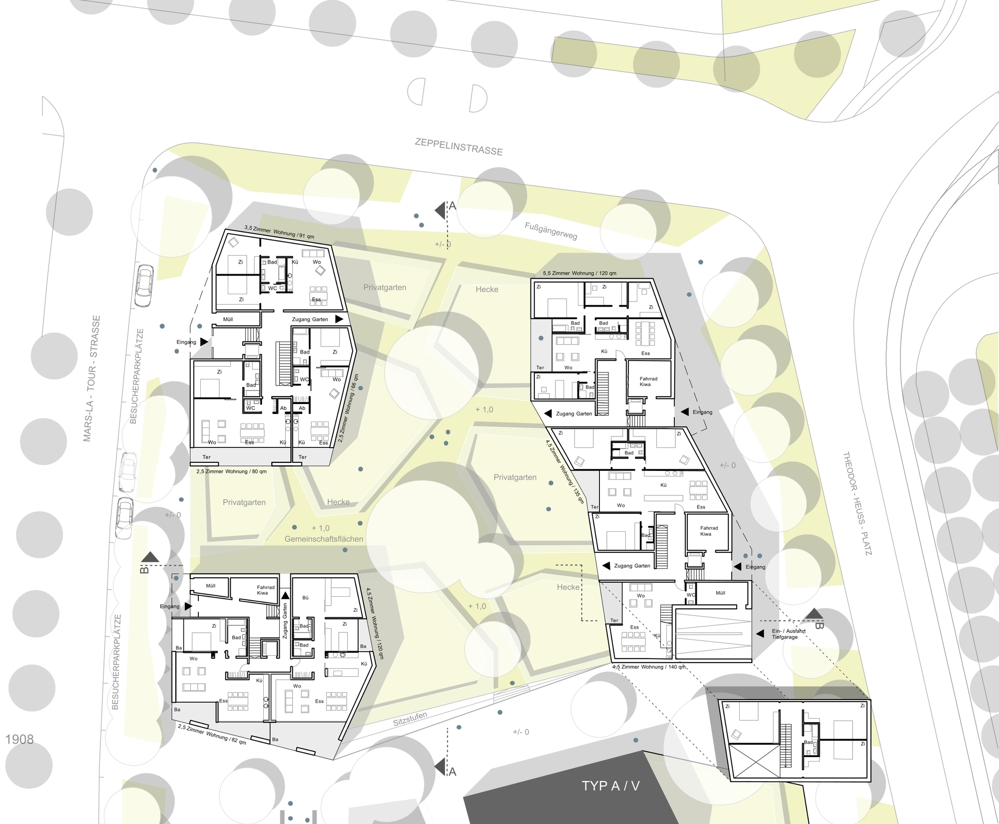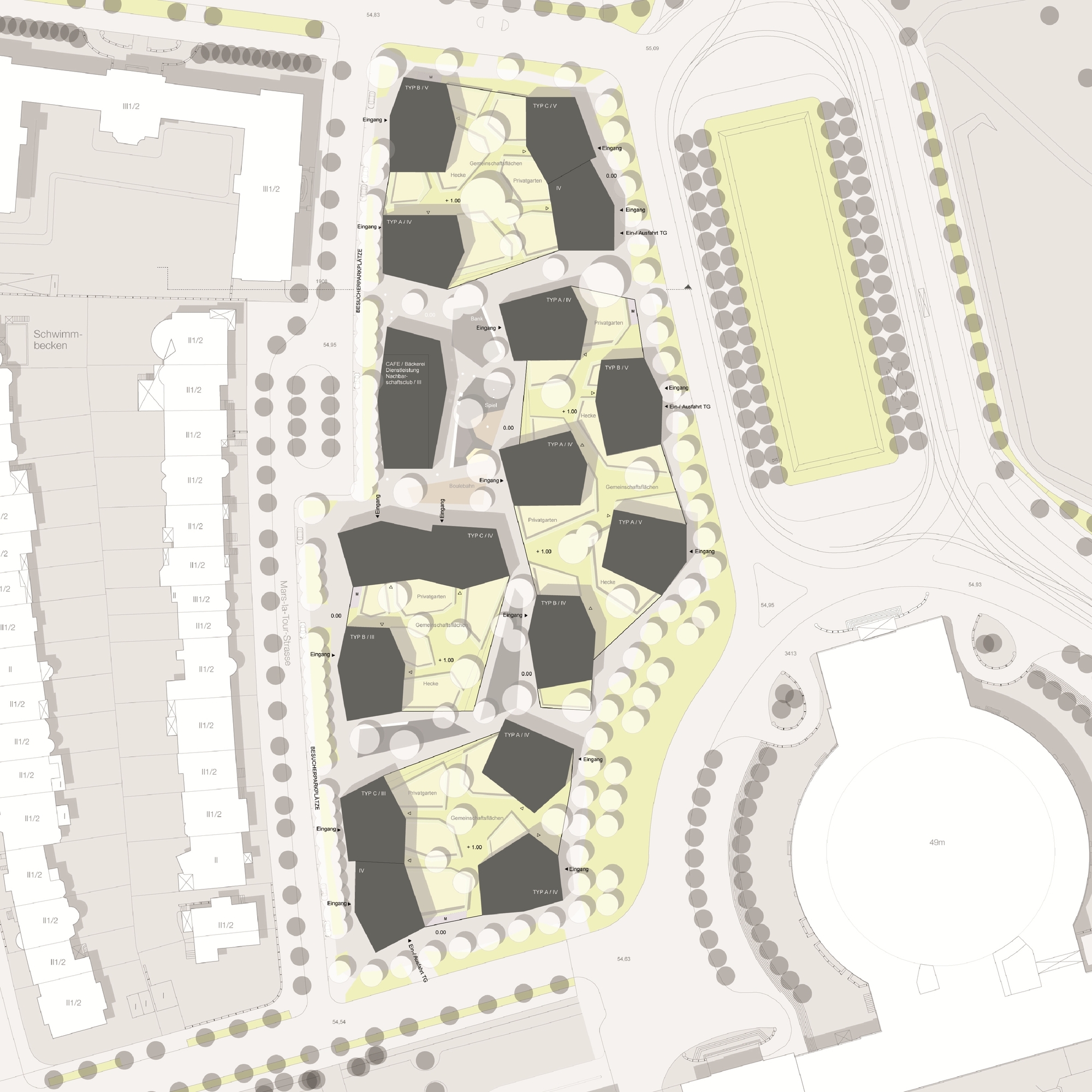 Aus verschiedenen städtebaulichen Entwürfen von Marazzi und Paul Architekten aus Zürich wählte ich gezielt den Entwurf mit den polygonalen Körpern aus und entwickelte daraus die Idee von ebenso polygonalen, erhöhten Schollen. Dies führte zu einer guten Abstufung der Außenräume in öffentliche, halböffentliche, halbprivate und private Freiflächen.